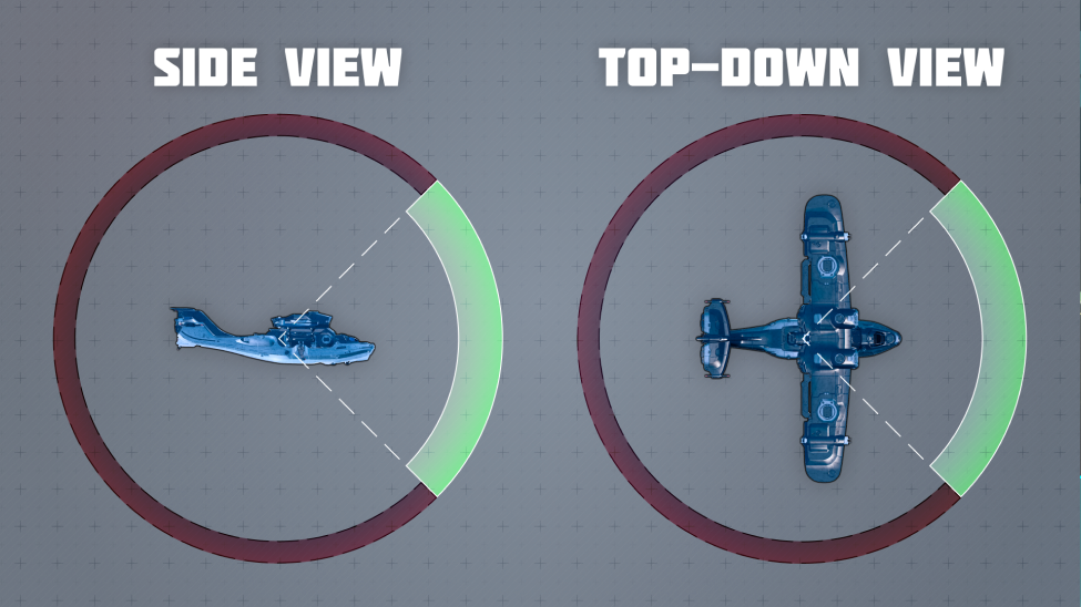 The core of the changes is that all weapons mounted on these ships can now fire at angles only within a specific zone in front of the ship. The size of this zone is 90 degrees along the vertical and horizontal axes in relation to the ship’s center. The image below shows the zone within which the weapons are able to aim.