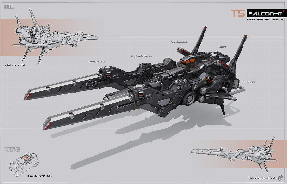 "Falcon-M" is a modern interceptor of the fifth generation, it's a perspective attack ship which can contain more fighting subsystems at the expense of a simplier interior design.