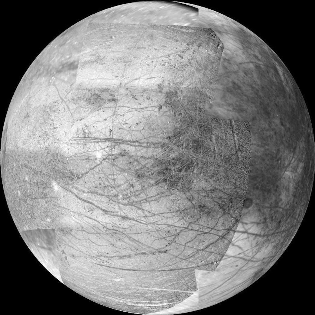 This 12-frame mosaic provides the highest resolution view ever obtained of the side of Jupiter's moon Europa that faces the giant planet. It was obtained on Nov. 25, 1999 by the camera onboard the Galileo spacecraft, a past NASA mission to Jupiter and its moons which ended in 2003.