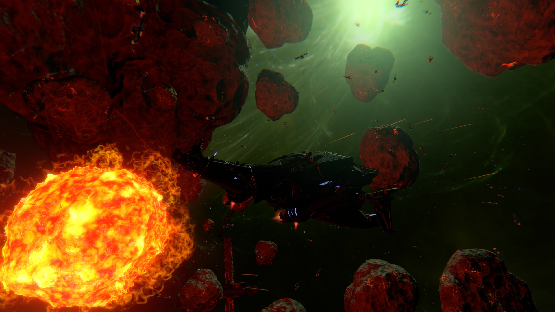 The action is swift and violent. In the most-played gamemode, “Arcade”, players respawn on a thirty-second timer; the less used and therefore ironically named "Regular" mode allows you to have one spawn per ship hull (you begin with three slots). The physics are vaguely realistic with an ability to move laterally with ease, though the overall effect is still that of flying through an atmosphere rather than a vacuum. This is less of a negative than it sounds, as the proliferation of asteroids and the occasional metal structures in maps creates a dynamic of constant motion.
