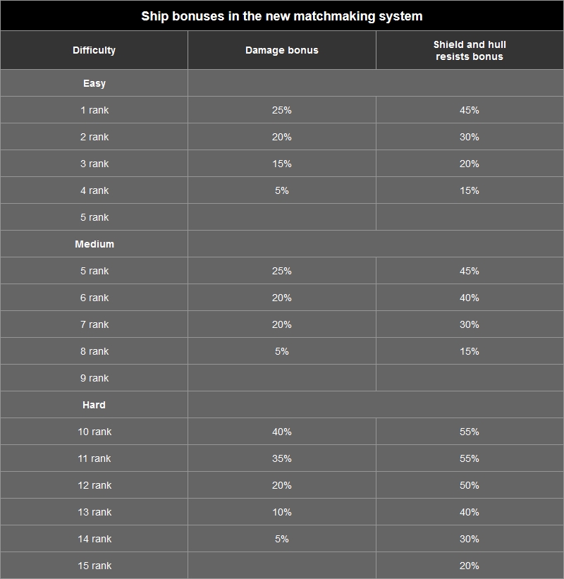 If your ship doesn’t have highest rank in the battle, it’ll be buffed by special bonuses. Bonus power depends on how close your rank to minimum available in certain fight. This allows the ships of small ranks to reduce the backlog in the technical specifications.